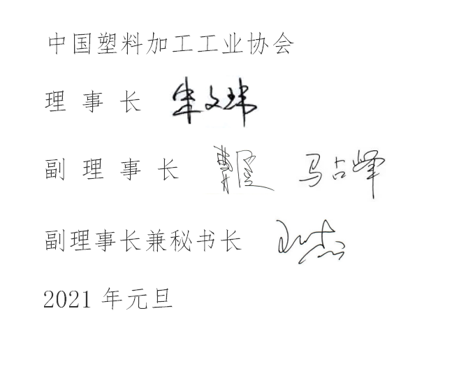 2021新年即将到来。在这辞旧迎新的美好时刻,我们谨向关心、支持、帮助中国塑料行业和中国塑料加工工业协会发展的各级领导、各界人士表示衷心的感谢!向多年来为行业发展做出突出贡献的专家、企业家表示崇高的敬意!向会员单位、广大展商及所有朋友们致以诚挚问候!