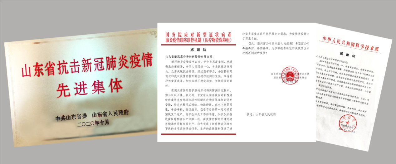 作为全国疫情防控重点保障企业,道恩股份是《塑料聚丙烯(PP)熔喷专用料》国家标准制定单位。在去年疫情期间敞开供应口罩布聚丙烯熔喷专用料,进一步打通医卫材料全产业链,并参与承担了国家科技部“可重复使用防护口罩关键技术和产业化”应急研发课题,以“硬核”抗疫的表现,得到了国务院、国家科技部及多省的感谢与表彰,为助力疫情防控和复工复产复学作出了贡献。