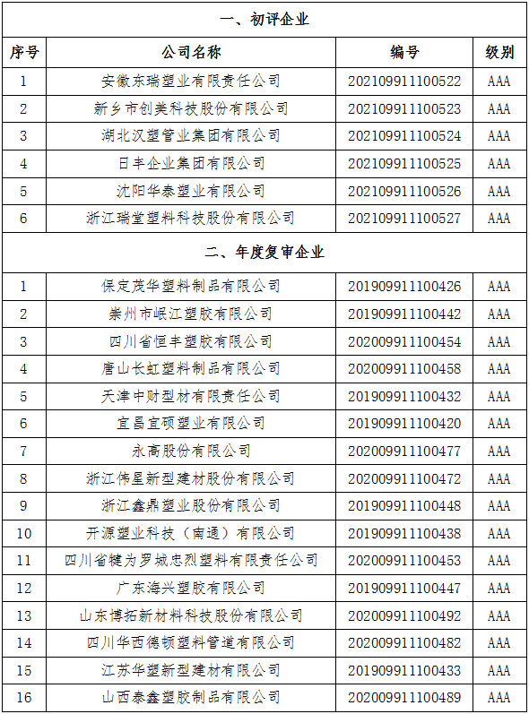 2021年第二批中国塑料行业企业信用等级评价结果公示