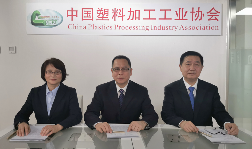 (中国塑协领导线下会场出席。中:理事长王占杰;右:副理事长王磊光;左:秘书长焦红文)