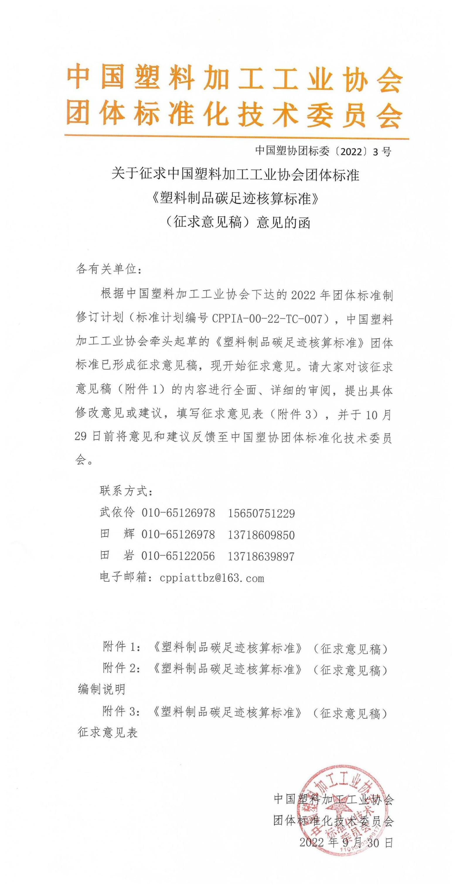 根据中国塑料加工工业协会下达的2022年团体标准制修订计划(标准计划编号CPPIA-00-22-TC-007),中国塑料加工工业协会牵头起草的《塑料制品碳足迹核算标准》团体标准已形成征求意见稿,现开始征求意见。请大家对该征求意见稿(附件1)的内容进行全面、详细的审阅,提出具体修改意见或建议,填写征求意见表(附件3),并于10月29日前将意见和建议反馈至中国塑协团体标准化技术委员会。