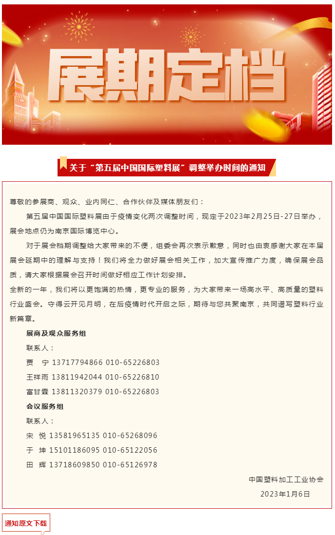 关于“第五届中国国际塑料展”调整举办时间的通知