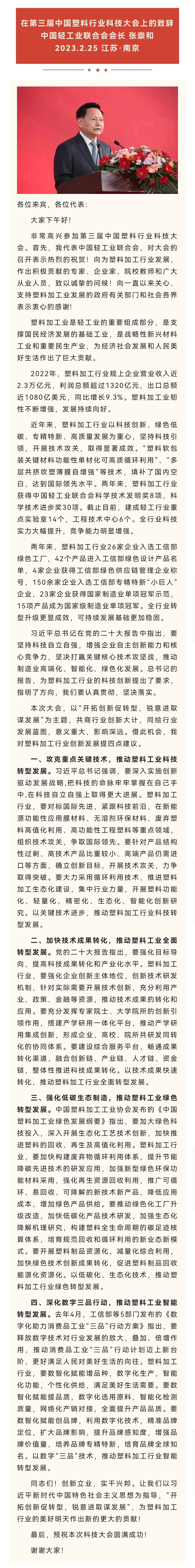 中国轻工业联合会张崇和会长在第三届中国塑料行业科技大会上的致辞