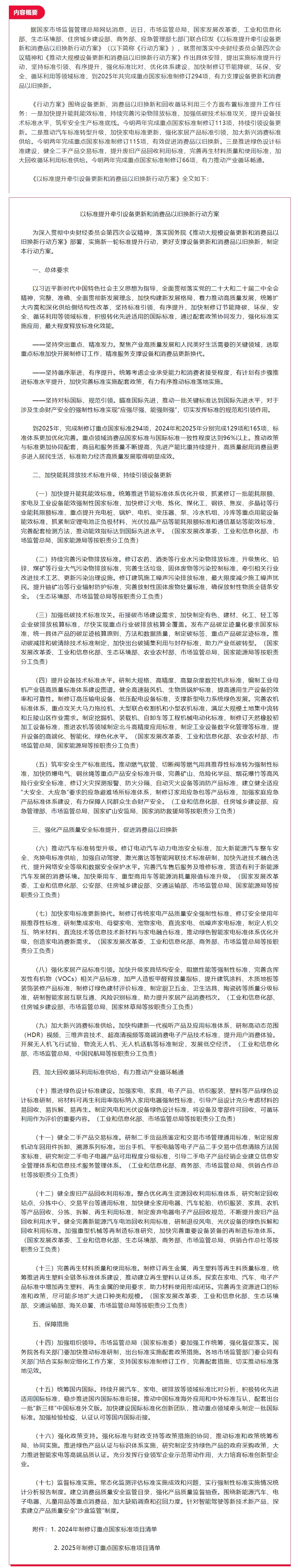 政策速递 | 市场监管总局等七部门关于印发《以标准提升牵引设备更新和消费品以旧换新行动方案》的通知