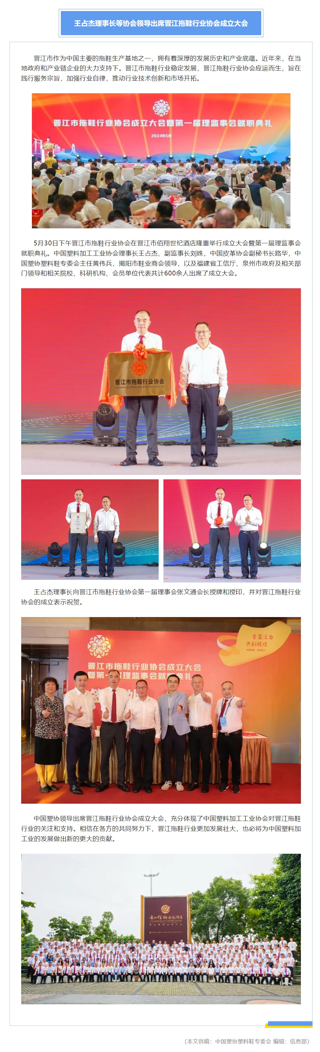 王占杰理事长等协会领导出席晋江拖鞋行业协会成立大会