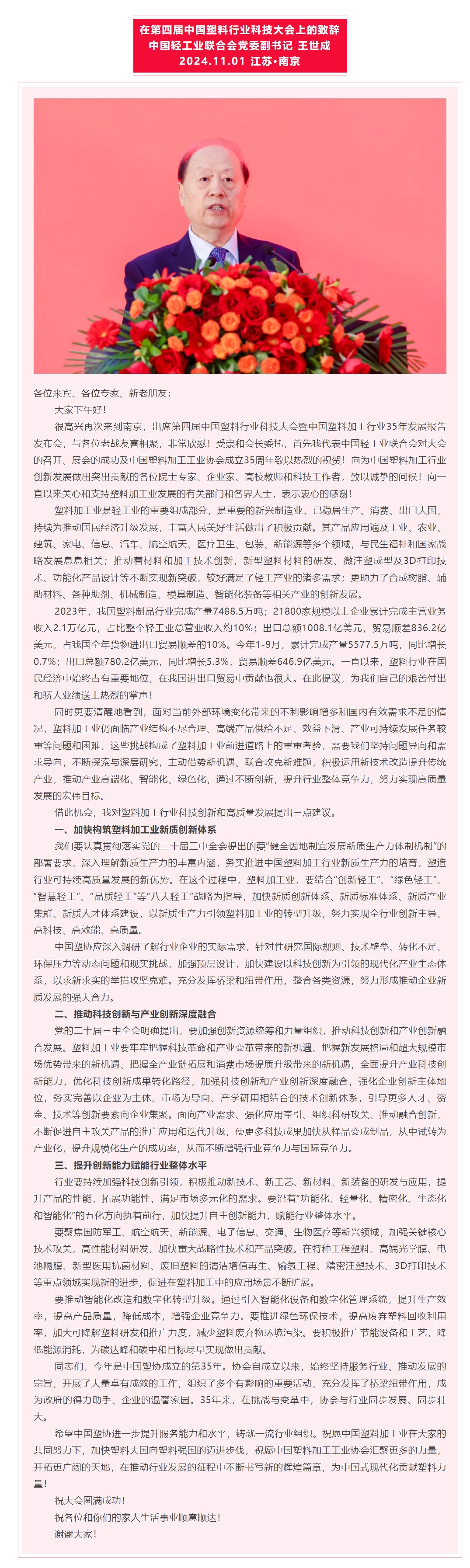 中国轻工业联合会党委副书记王世成在第四届中国塑料行业科技大会暨中国塑料加工行业35年发展报告发布会上的讲话
