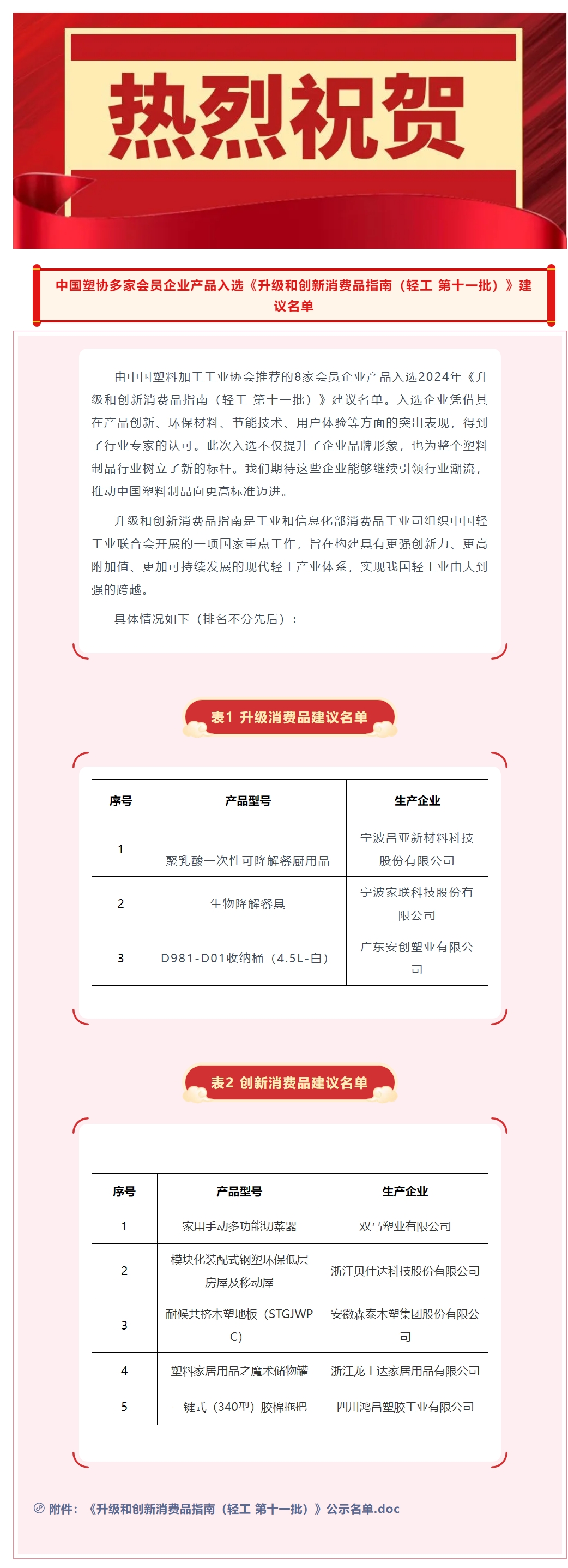 祝贺中国塑协多家会员企业产品入选《升级和创新消费品指南(轻工 第十一批)》建议名单
