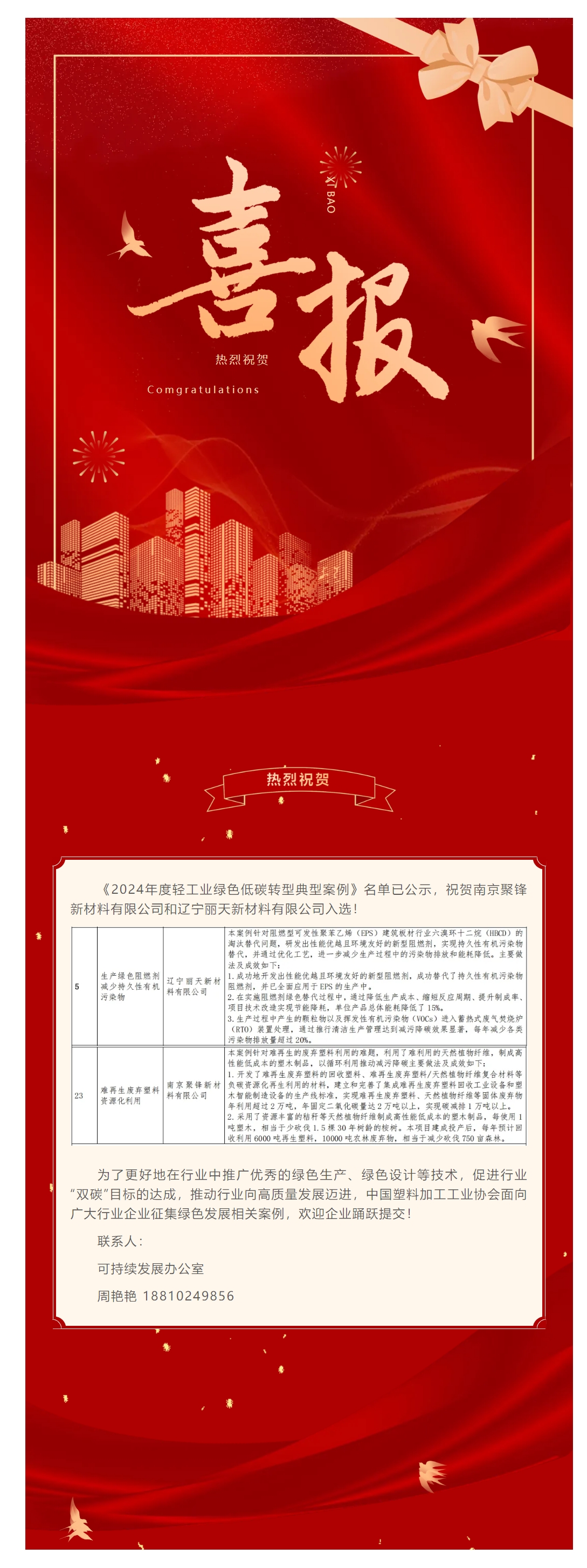 祝贺南京聚锋新材料有限公司和辽宁丽天新材料有限公司入选《2024年度轻工业绿色低碳转型典型案例》名单
