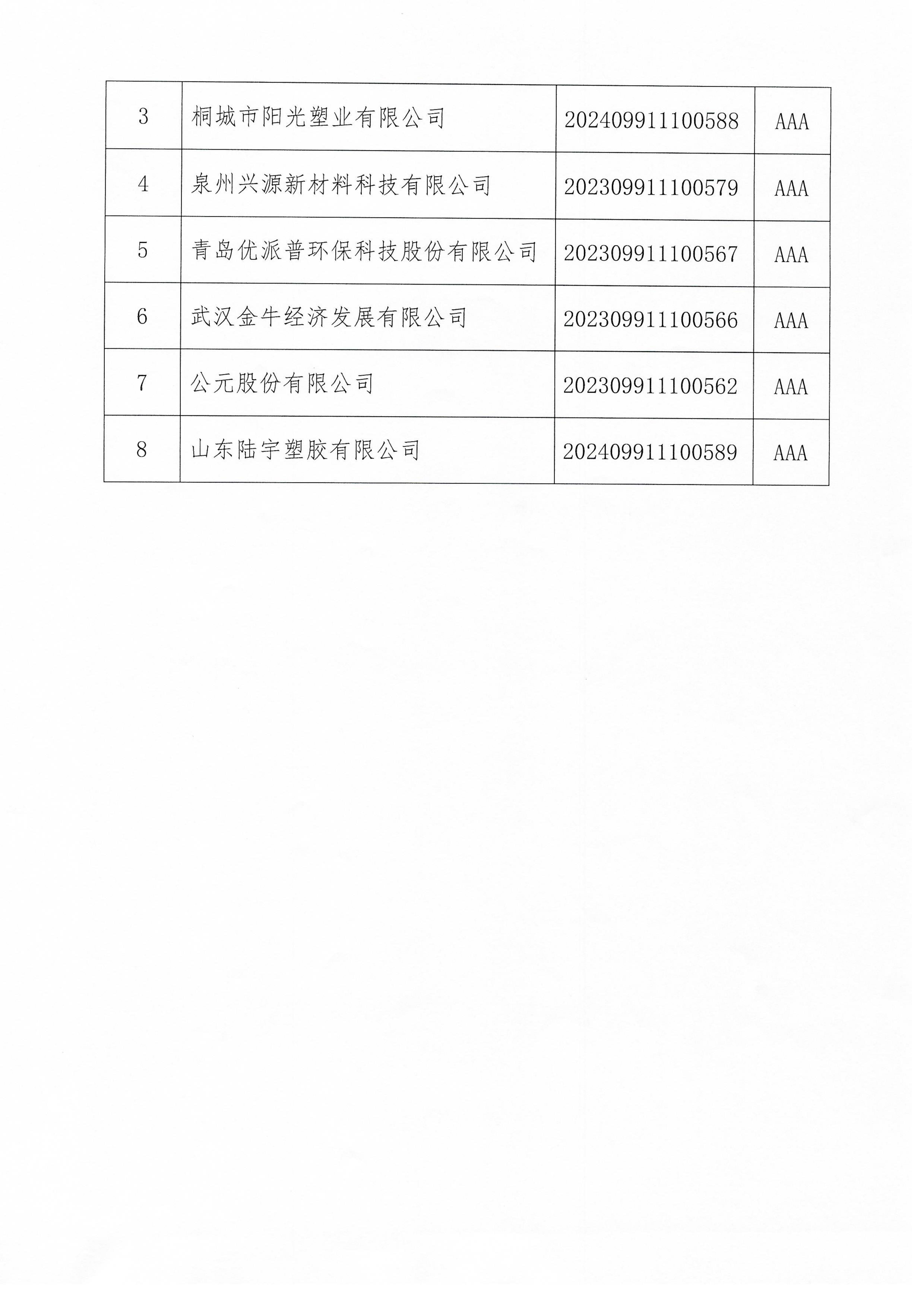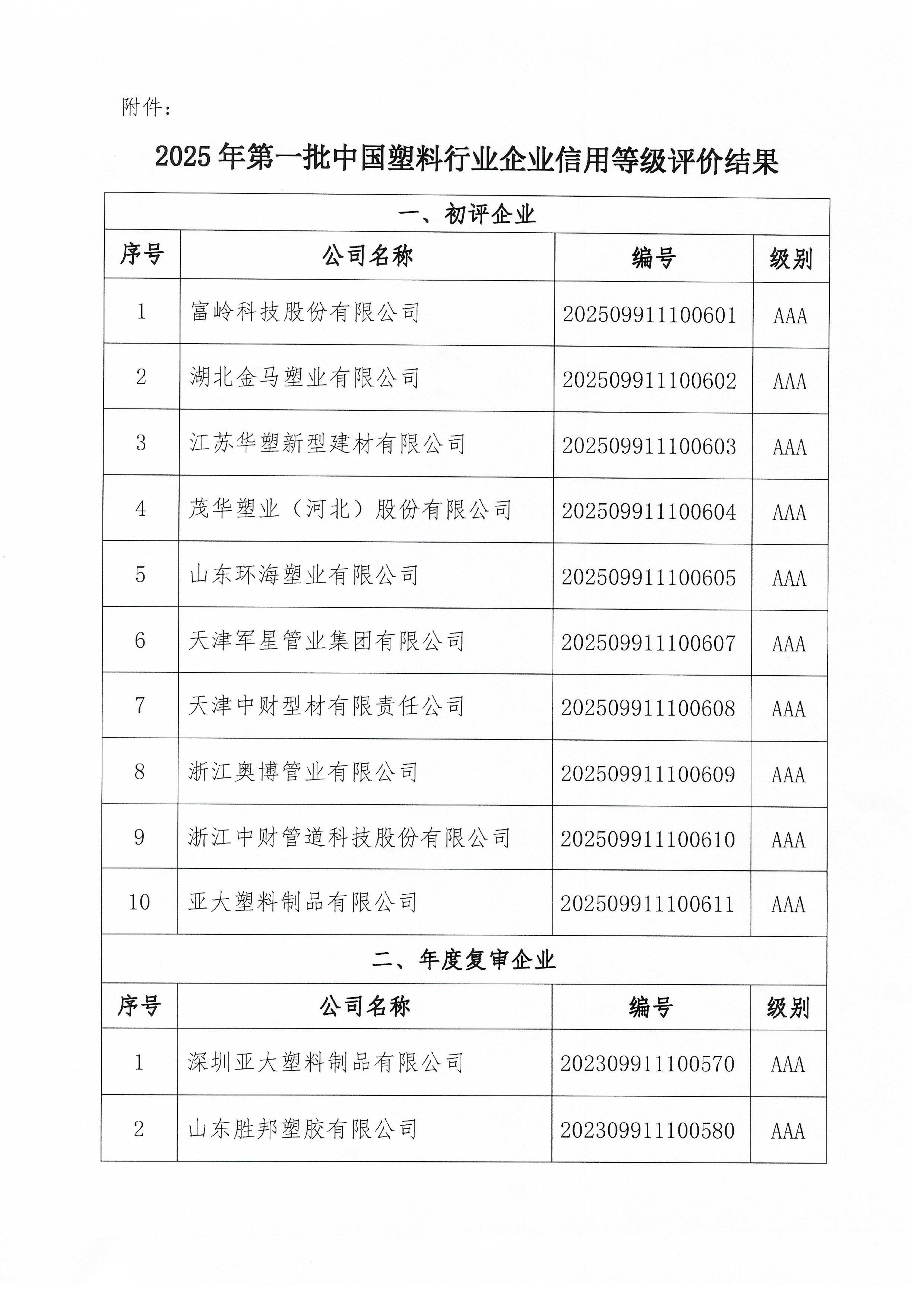 2025年第一批中国塑料行业企业信用等级评价结果公示